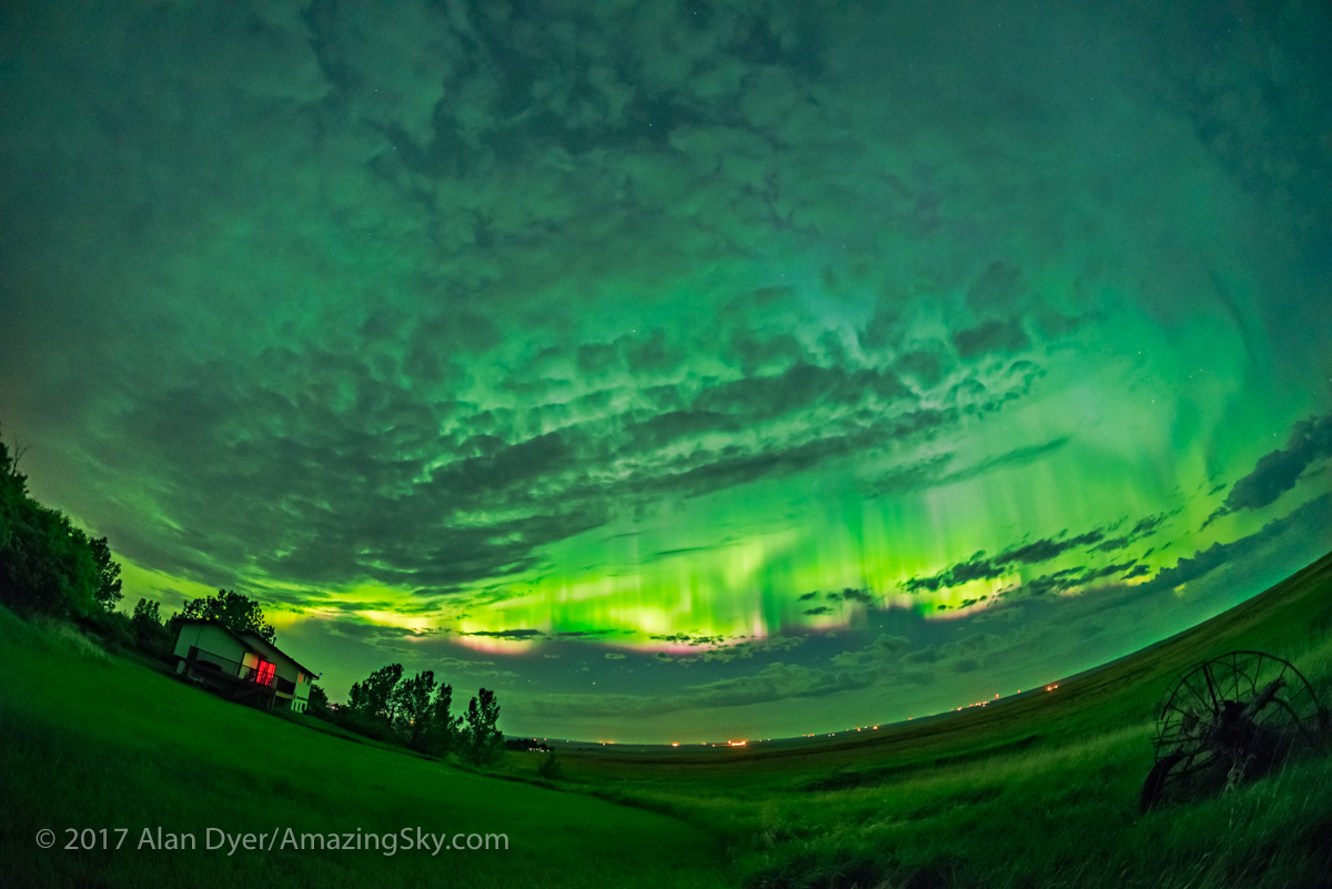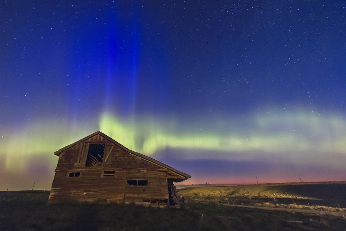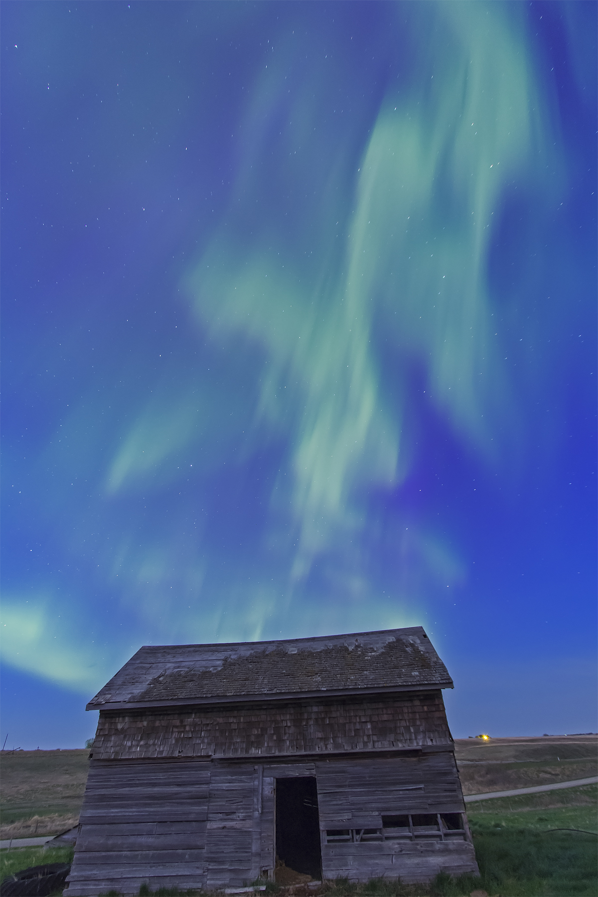 I set up May 17 at my neighbourhood rustic farmstead for a night of time-lapse shooting of the old barn in the moonlight, but knowing an aurora was likely. My iPad app beeped and alerted me to that possibility only an hour or so before sunset, letting me know a storm was underway. And sure enough, as soon as it got dark, there were the curtains of green dancing all over the blue twilight sky. This frame is from 1200 I shot in a dusk to dawn time-lapse movie. It is from early in evening, with a pink glow of twilight still fringing the northwest horizon.