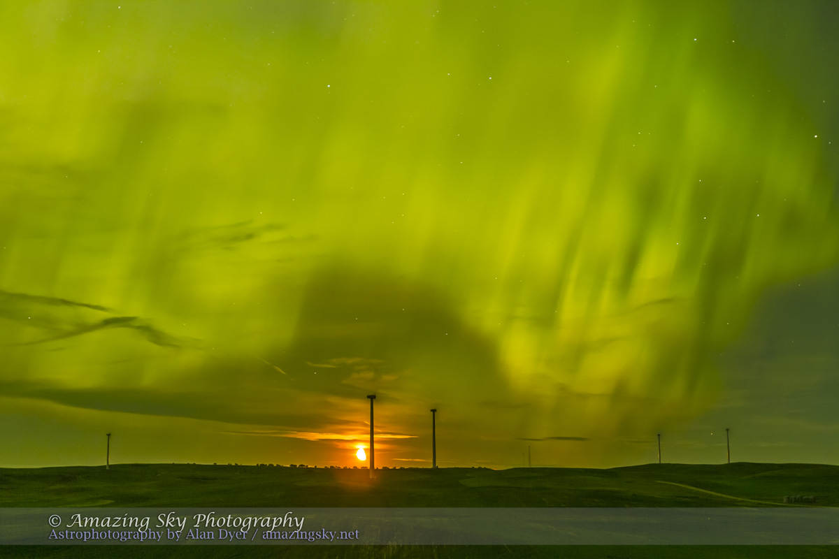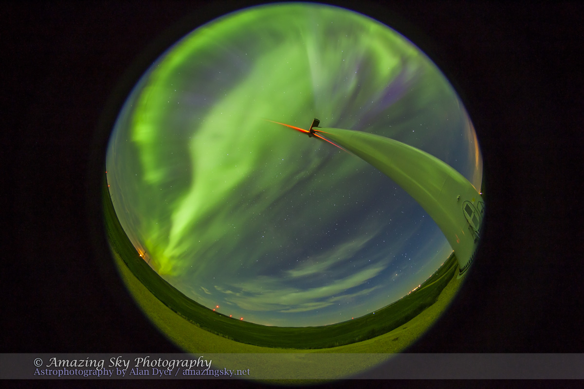 Forewarned, I headed out to the Wintering Hills Wind Farm near my home in southern Alberta. I thought it would be neat to get shots of the effects of the solar wind from beneath and beside the wind turbines of the farm. The shot above is from a time-lapse movie taken with a fish-eye lens that will look great when projected in a full-dome digital planetarium.