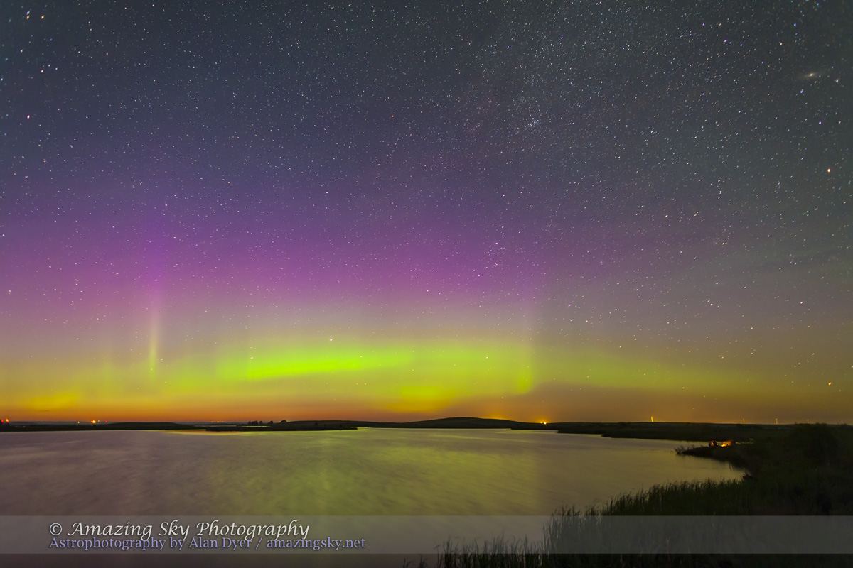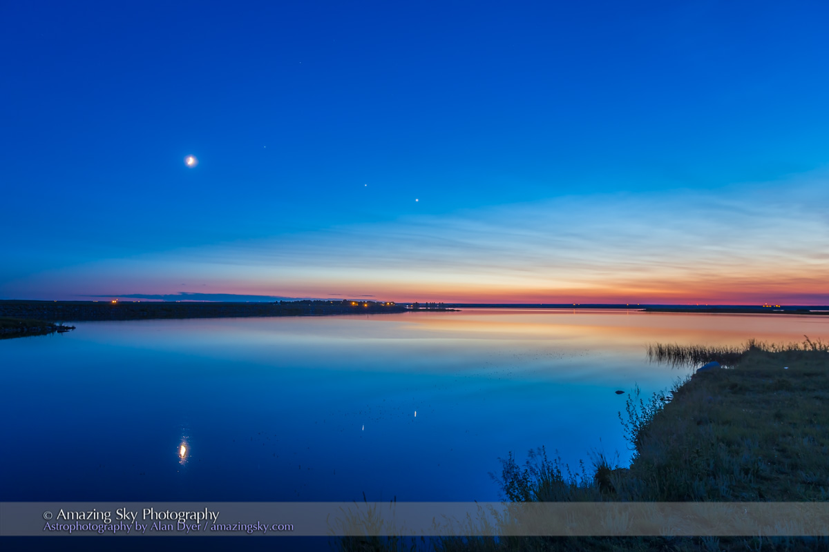 Last night I went out to a nearby lake (there aren’t many in southern Alberta!) to shoot the twilight over water, and hoping to catch some aurora or noctilucent clouds as well.