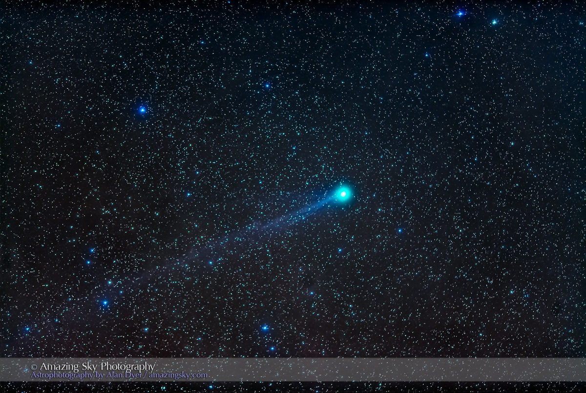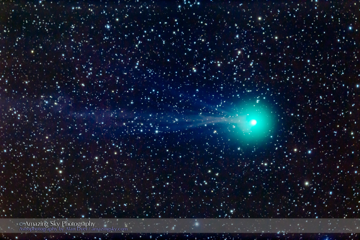 This is a closer view, with a telephoto lens, of the comet from Sunday night, January 11, showing how its faint blue ion tail stretches back several degrees. However, only the long exposures used here pick up the full extent of the tail. Visually, even through binoculars, just a hint of a tail is visible extending to the left away from the large fuzzy coma, or head of the comet.
