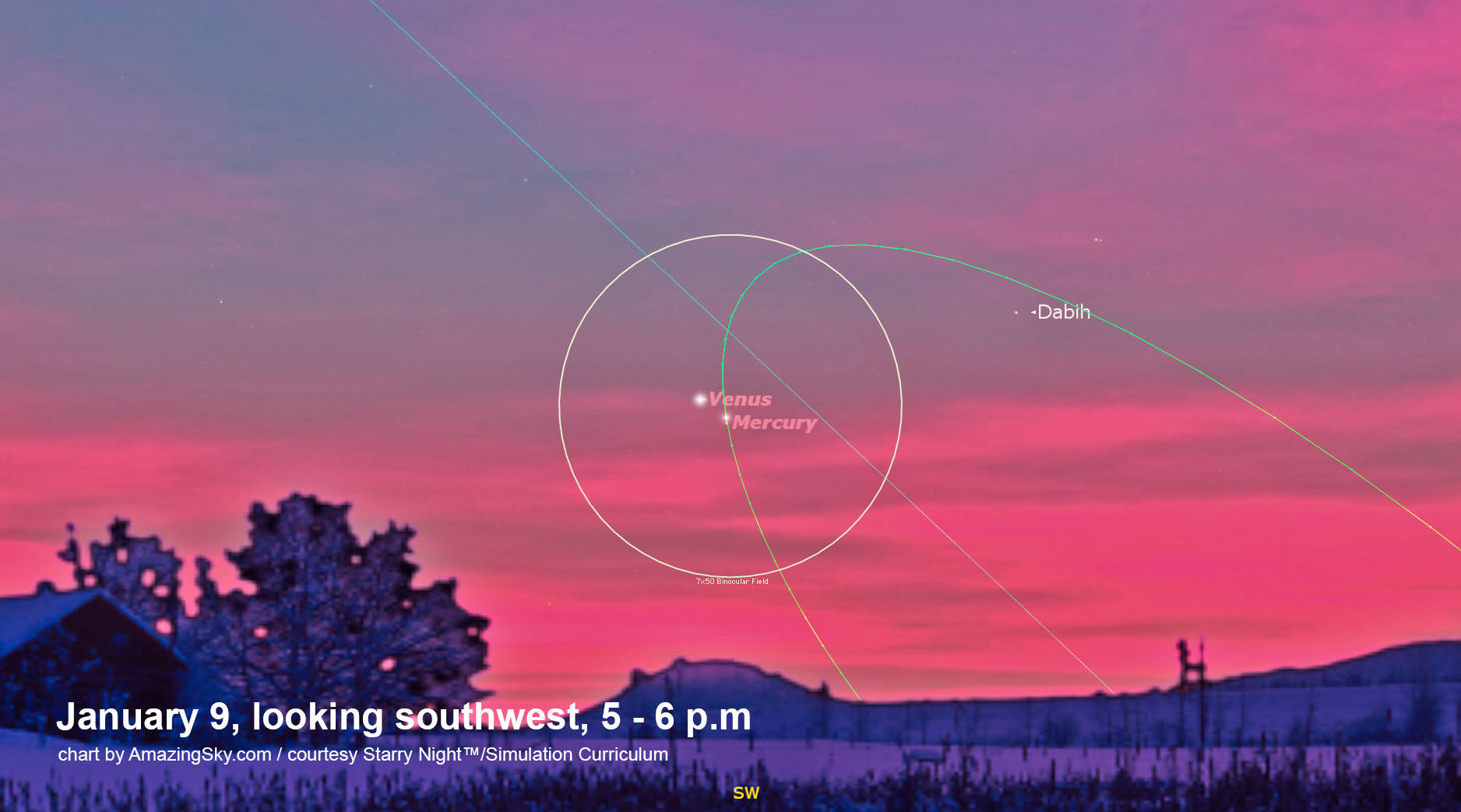 This weekend and for theย following week (January 9 to 18) look southwest to see brilliant Venus accompanied in a close conjunction by elusive Mercury.