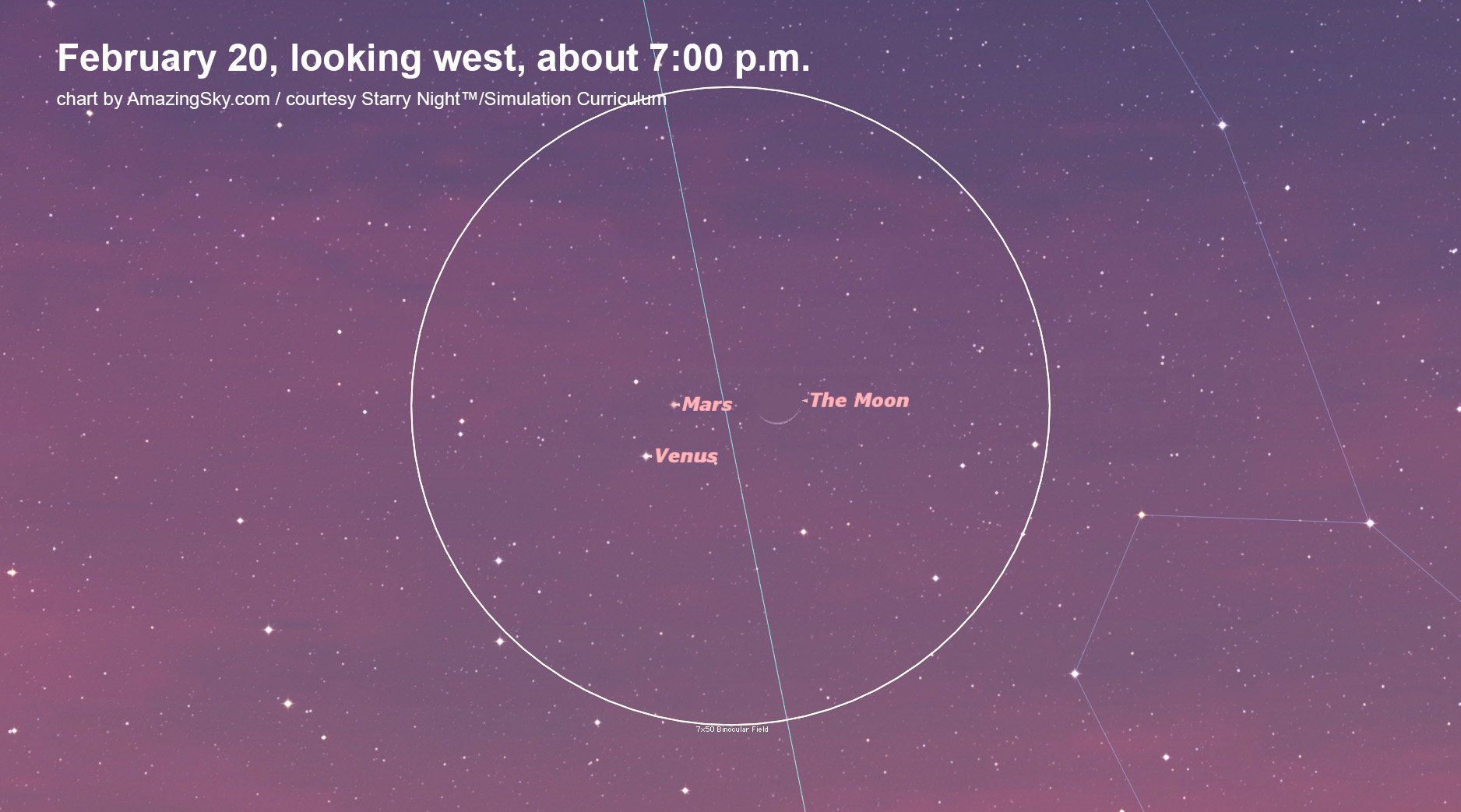 On the evening of February 20, the waxing crescent Moon joins Venus and Mars in the western sky to create a tight gathering of worlds in the twilight.