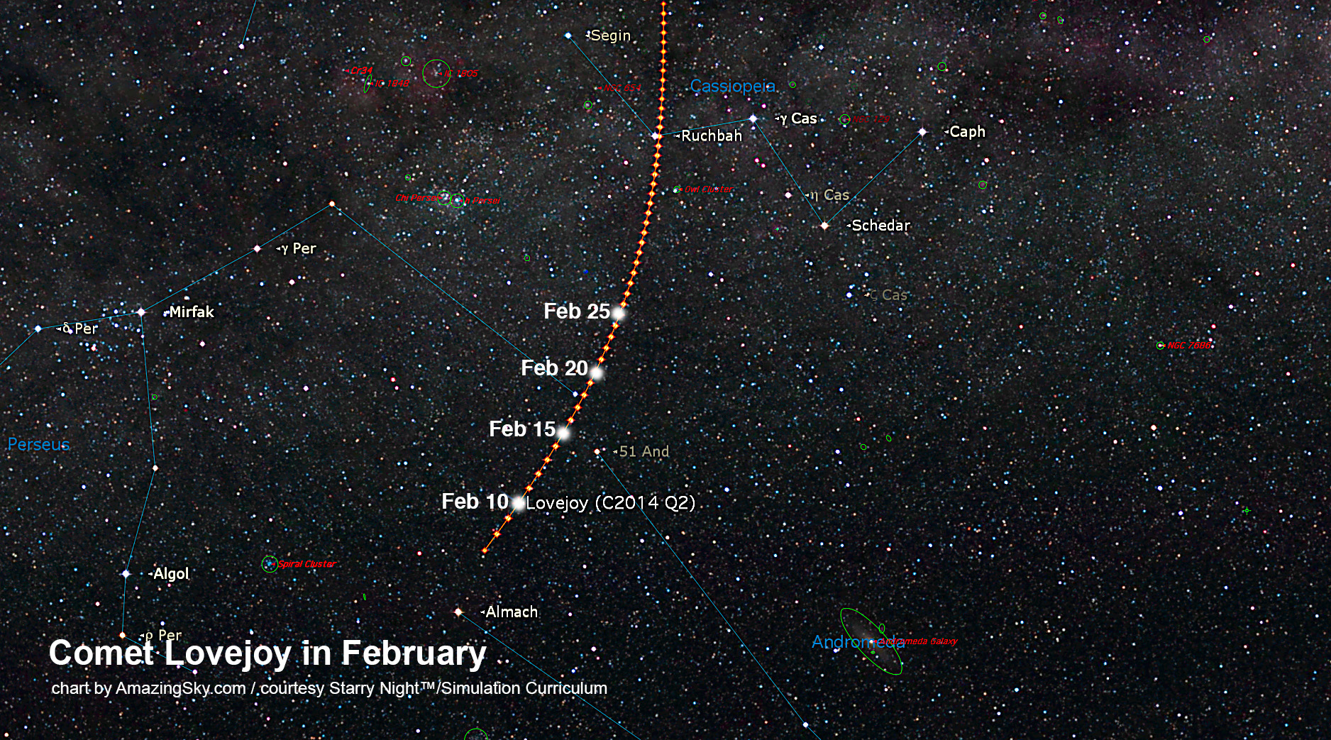 Meanwhile, Comet Lovejoy (C/2014 Q2) continues to perform well. It is now in the northwestern sky in the early evening, as it travels up through Andromeda into Cassiopeia.