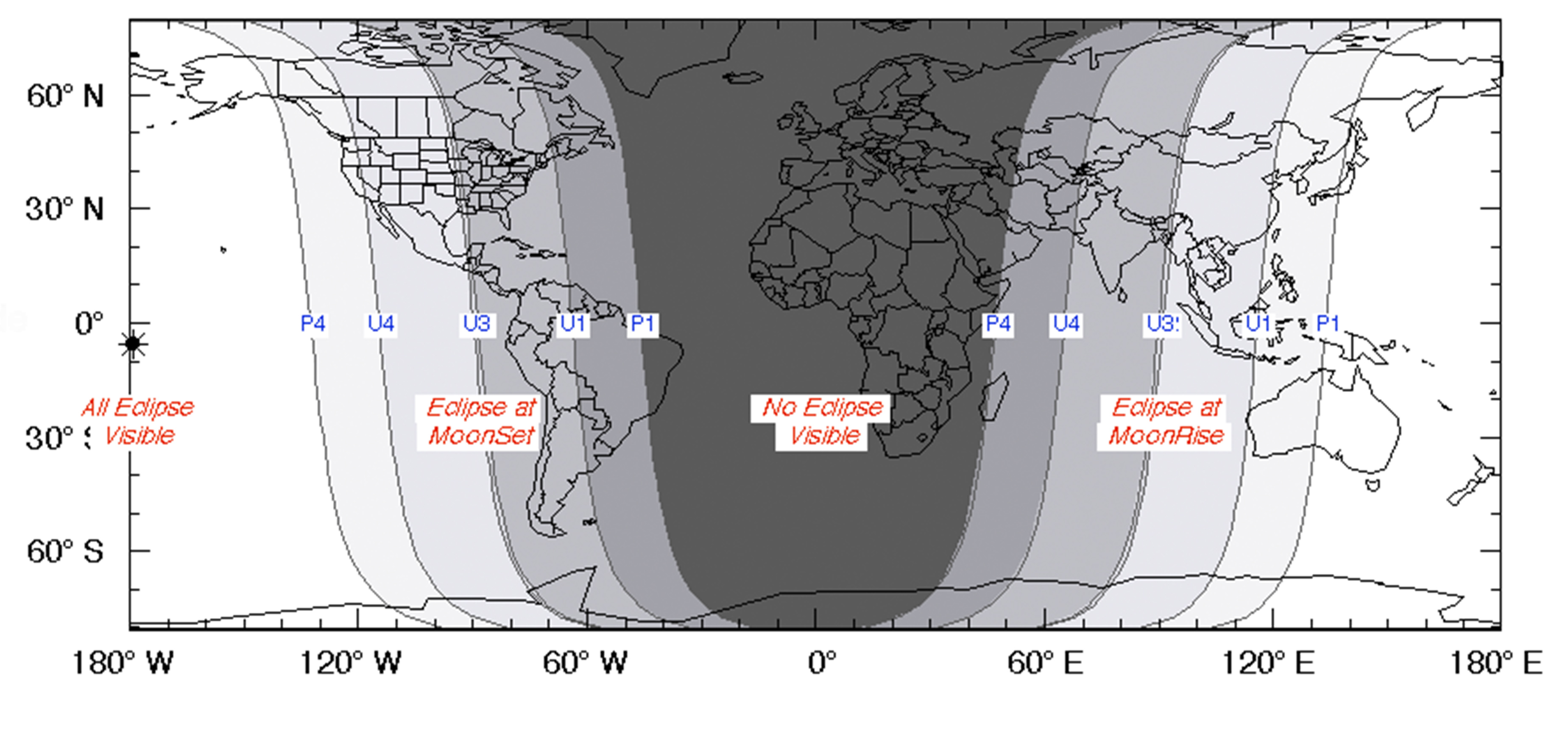 The South Island of New Zealand sees a sunset eclipse (the shadow passes over Milford Sound) that lasts 2m55s, longer than the 2017 eclipse in the United States.