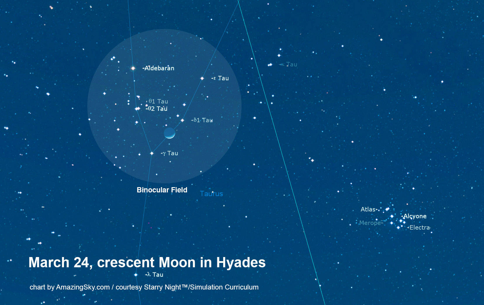On Tuesday, March 24, the Moon, still a crescent, shines amid the stars of the Hyades star cluster near Aldebaran in Taurus, for a wonderful binocular scene. The more famous Pleiades star cluster is near by.