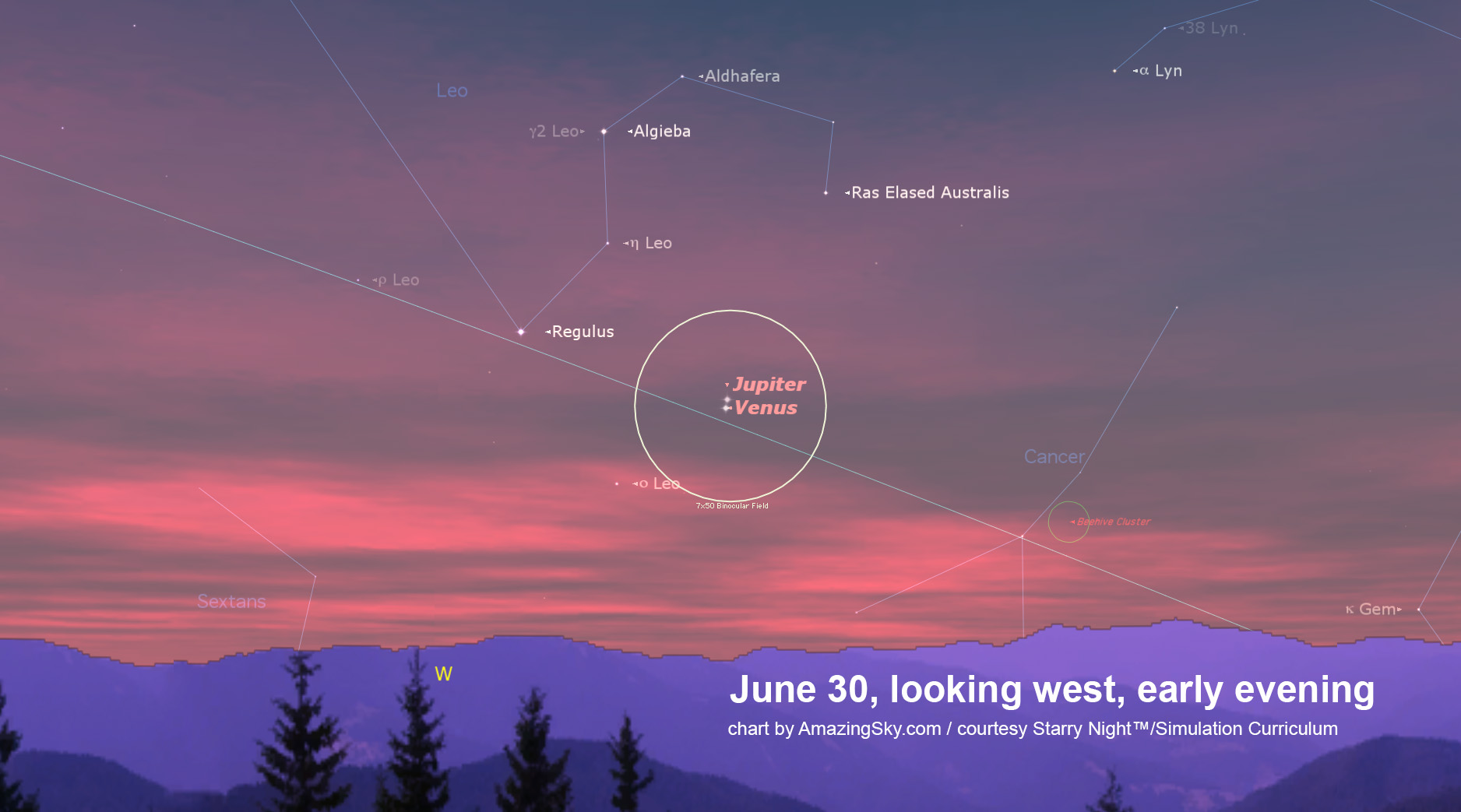 Mercury passes less than a degree from Venus this weekend (the circle shows a typical 7ยฐ binocular field).