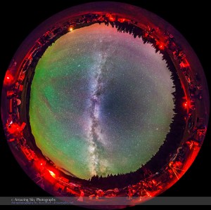 A 360° panorama of the Table Mountain Star Party, July 25, 2014, held at the Eden Valley Guest Ranch in northern Washington state. It shows the Milky Way arching overhead (zenith is at the centre), and bands of airglow streaming out of the east at left. Southwest is at the bottom where the bright centre of the Galaxy area meets the horizon. The Big Dipper is at the right of the frame. This is an 8-section panorama, with each section shot with a 14mm Rokinon lens in portrait format, at f/2.8 and Canon 5D Mark II at ISO 6400 for 45 seconds each, untracked. Assembled in PTGui using Stereographic Down projection.