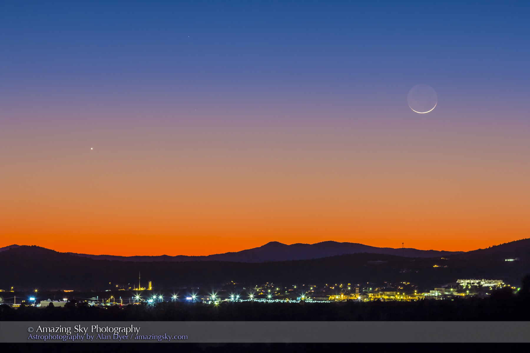 The thin Moon and Venus hang over the lights of Silver City, New Mexico.