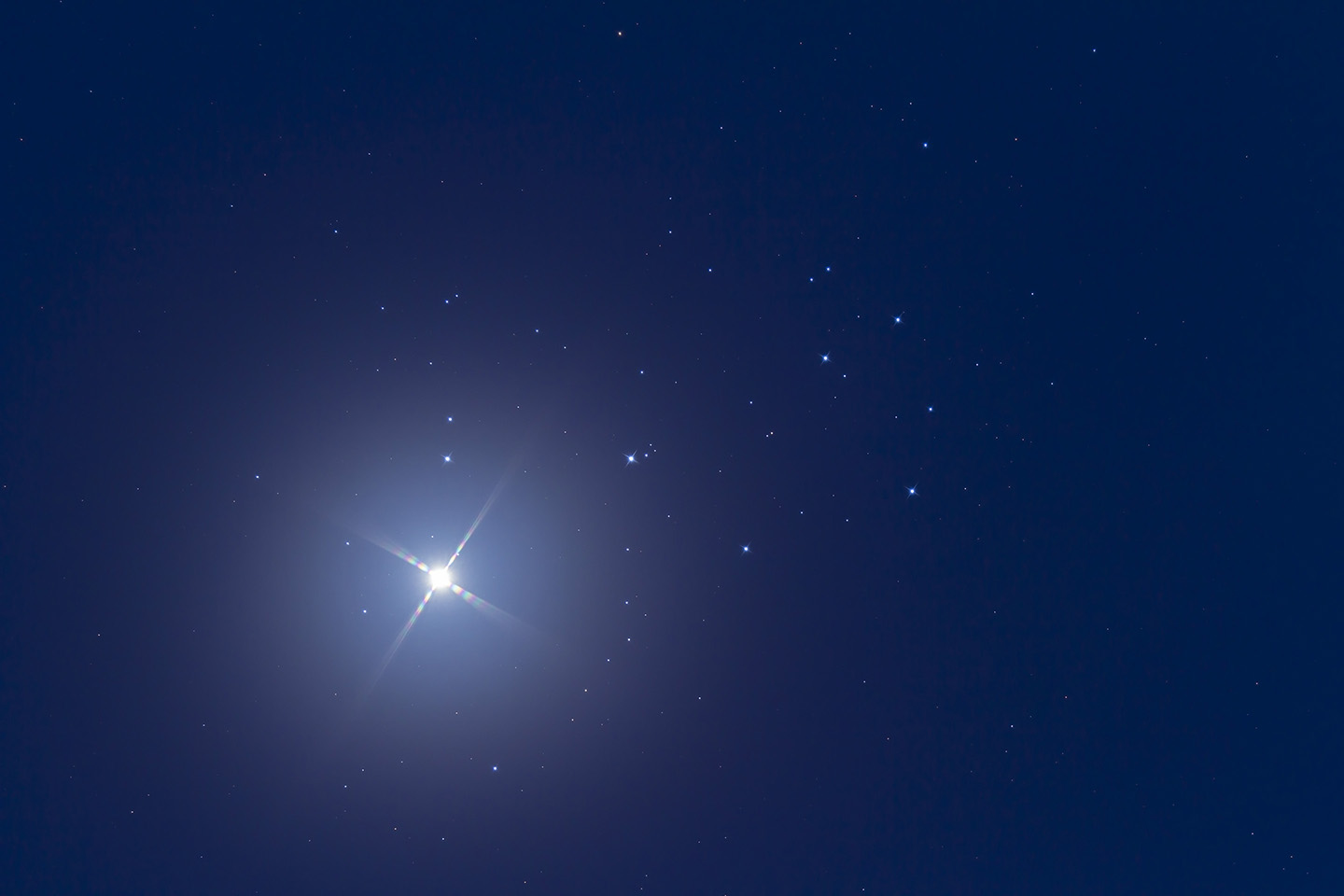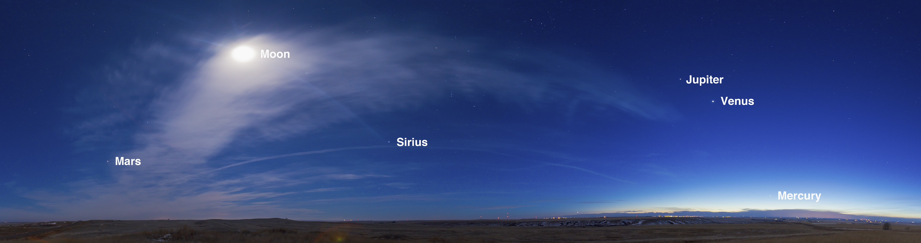 This wide-angle shot takes in the evening sky from the duo of planets in the west (right) to Sirius shining brightly in the south (left), with Orion in between. Above and to the right of Orion sit the two big naked eye star clusters of winter: the scattered Hyades and the compact Pleiades.