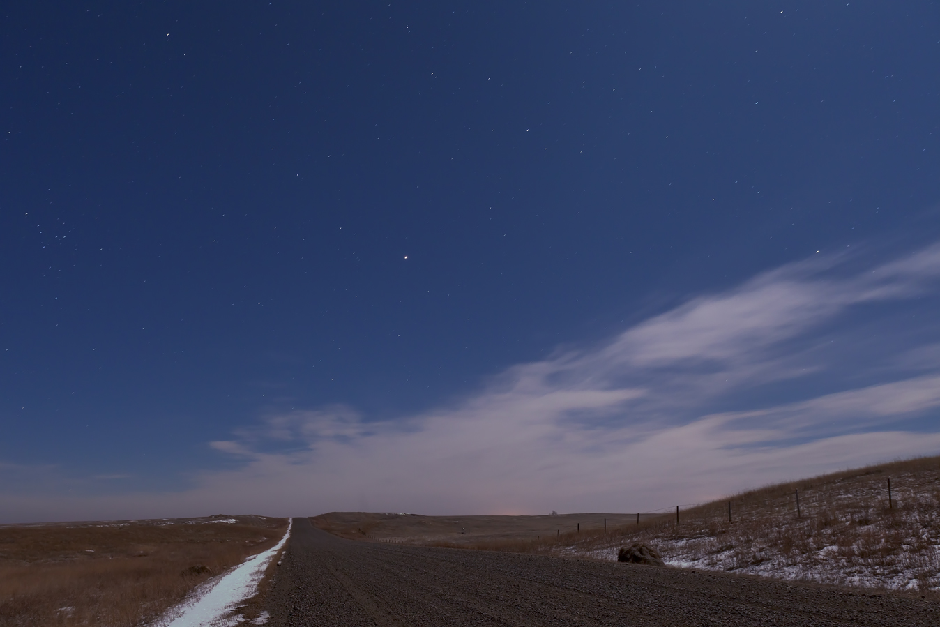 The time is just after sunset, as the last light of the Sun still illuminates the clouds. This is the magic hour for photography, and for taking in the solitude of the “Great Lone Land” as author William Francis Butler described it in his book of that title in 1872.
