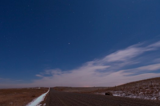 I took this shot March 4, with the Moon just off the frame at the top. Here, the eastbound county road seems to head off across the Prairies to Mars. It’s got a long way to go. Even at its closest right now, Mars is still 100 million kilometres away.