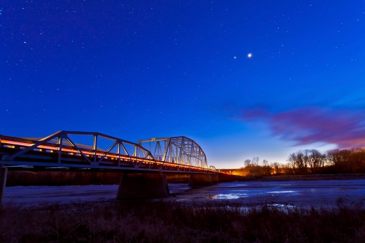 To capture the nightscape I hunted around for a spot along the Bow River near home and settled for a site on the banks of the river at the point called Blackfoot Crossing, the traditional heart of the Siksika First Nation land. Here, the Bow River runs north-south for a stretch and the highway crosses the river heading west into the evening twilight, as if off into the sky to meet Venus and Jupiter in conjunction.