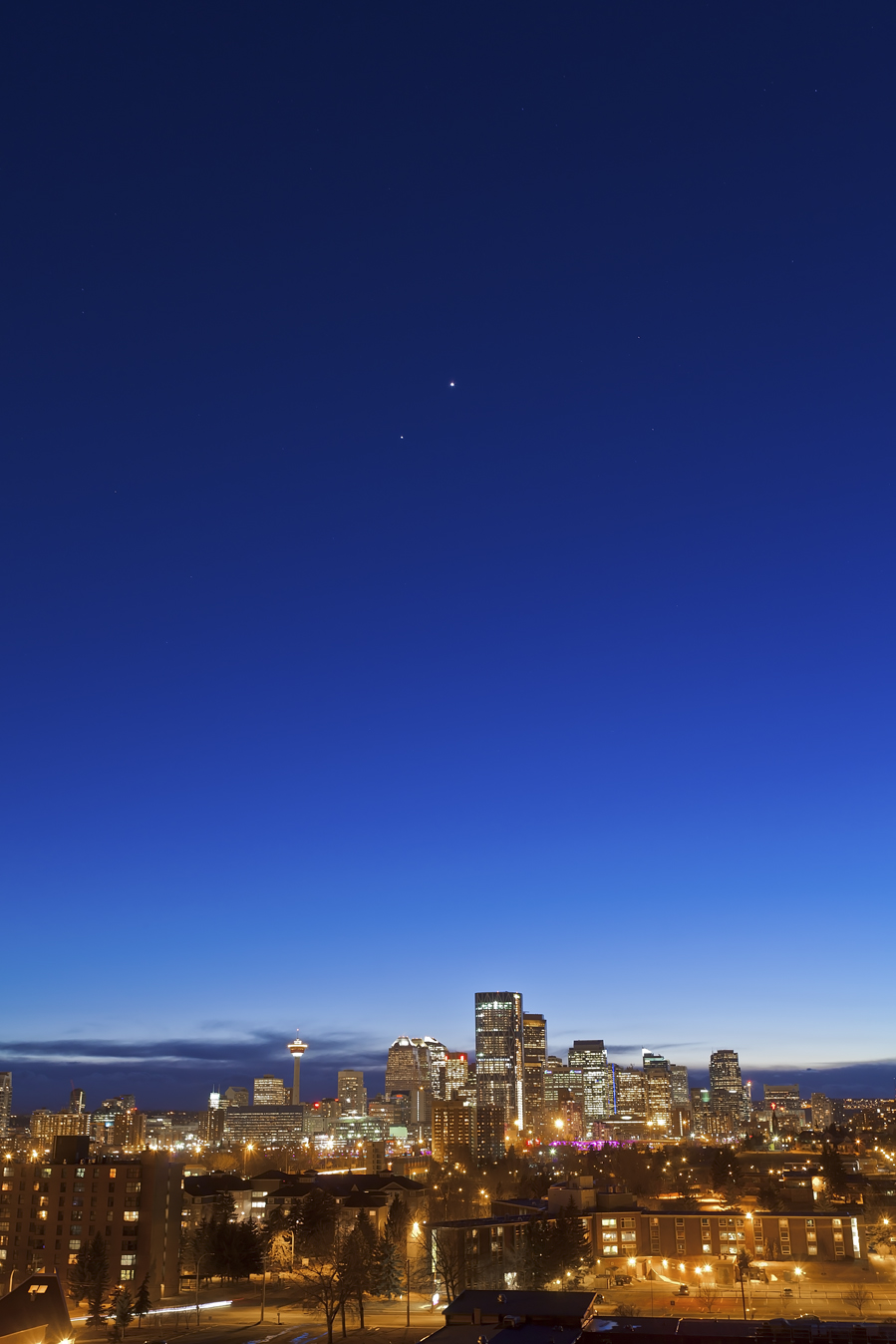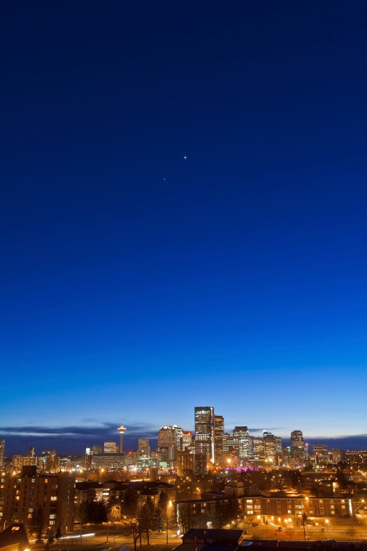 For my continuing series of Venus-Jupiter conjunction shots, on Wednesday night I stayed in Calgary and shot the planets over the city skyline.