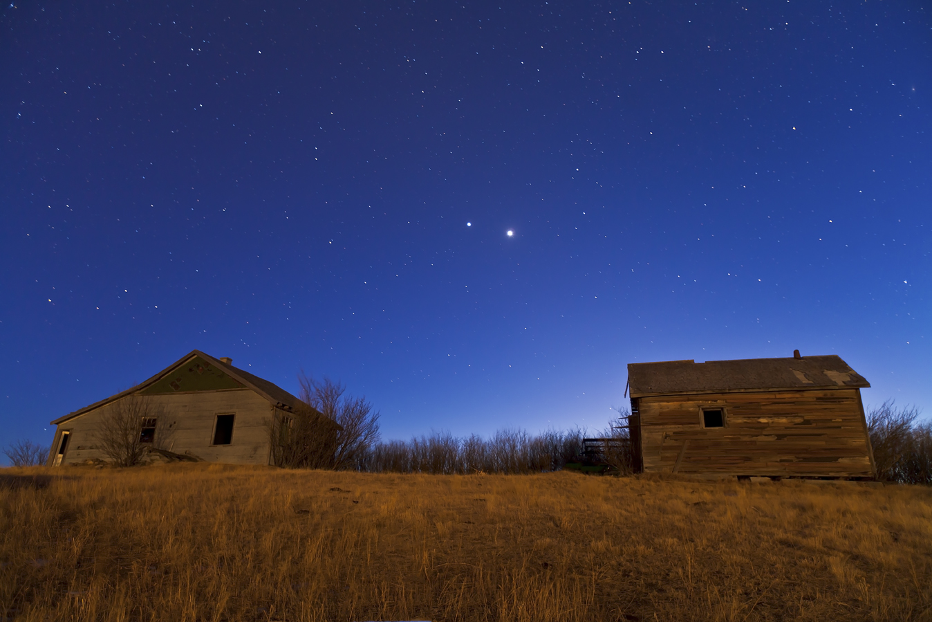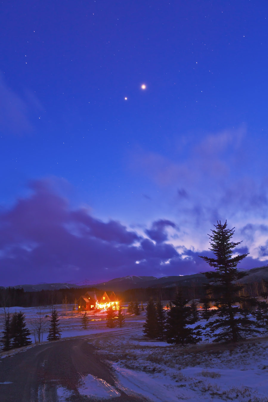 This was the picture-perfect scene last Tuesday night when I shot other frames of just the planets over the house in the foothills of the Rockies near Bragg Creek, Alberta. This is the wider scene, bathed in the deep blue of twilight.