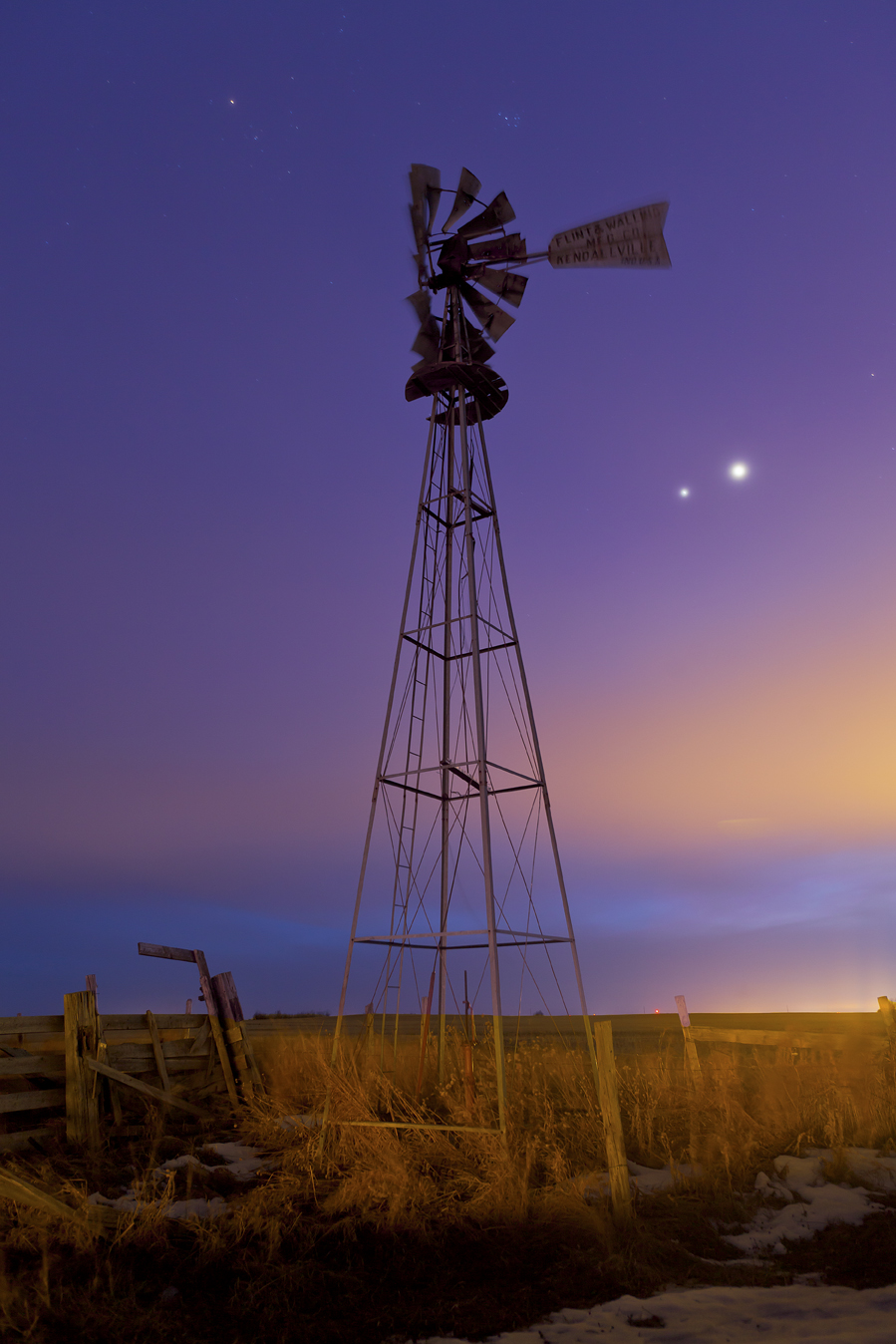 Here they are behind one of the icons of the prairies, an old water pump windmill, made it would seem by the Flint and Walling Mfg. Co of Kendallville, Indiana, USA, probably in the 1930s or 40s. My area of southern Alberta was once considered too dry for agriculture and it was only irrigation that made the land livable. Individual farm pumps of the dustbowl era were replaced by a mega-project system of canals and reservoirs to water what is effectively a desert. And a windswept one. A blustery Chinook wind was blowing this night.