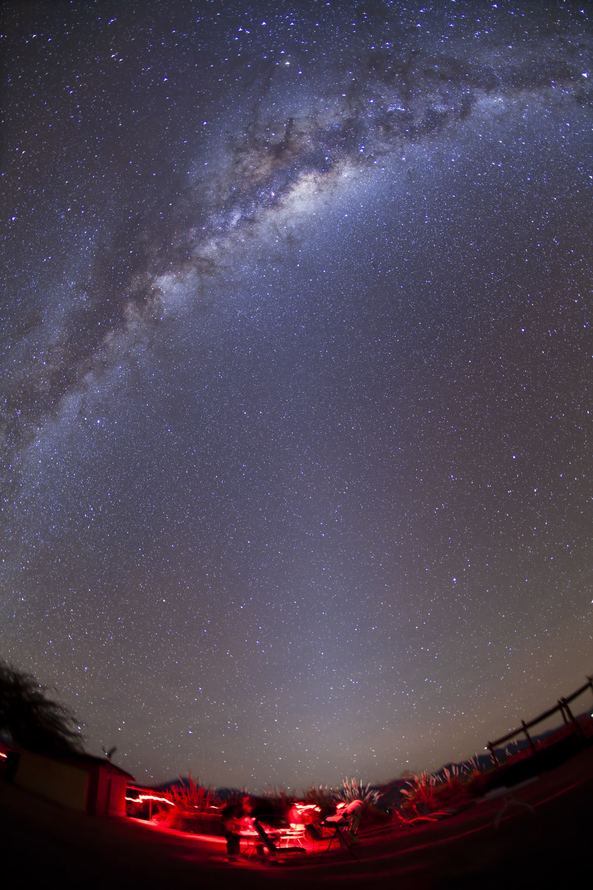 I took this panorama from the Atacama Lodge in north central Chile, using the Canon 5D MkII and Canon 35mm lens. Each of the 6 segments that went into this pan was itself a stack of 4 x 6 minute exposures, plus a fifth exposure through a soft-focus filter, all at f/4 and ISO 800. The camera was on a Kenko SkyMemo tracking platform. I assembled the pan with Photoshop CS5’s Photomerge command. This is actually only half of the full panorama mosaic, which extends for another 5 segments to the right along the Milky Way to Orion, taking in the entire southern portion of the Milky Way. But this is the best bit!