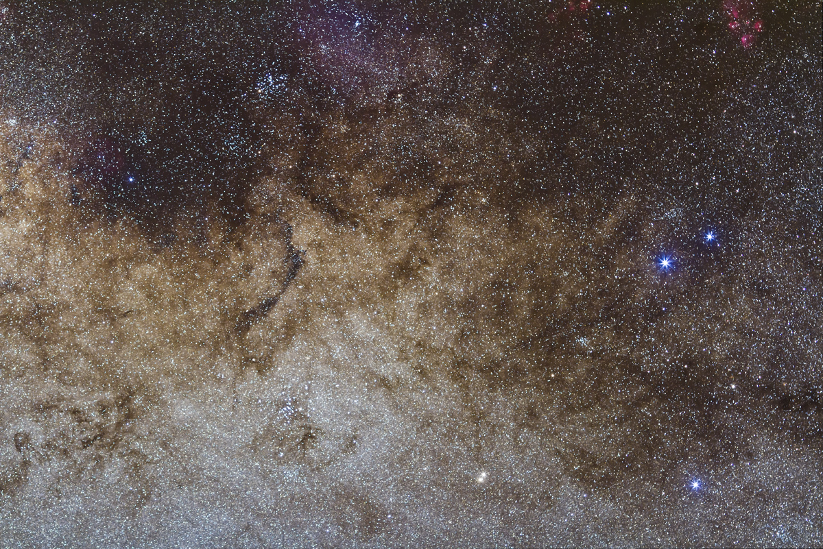 — Also apparent are the extensive dust clouds at left extending from Ophiuchus (at top) down into Aquila, well below the plane of the Galaxy. Most wide-angle shots of the Milky Way I see tend to process out the subtle brown clouds that extend far off the Galactic plane. And they are brown, not black.