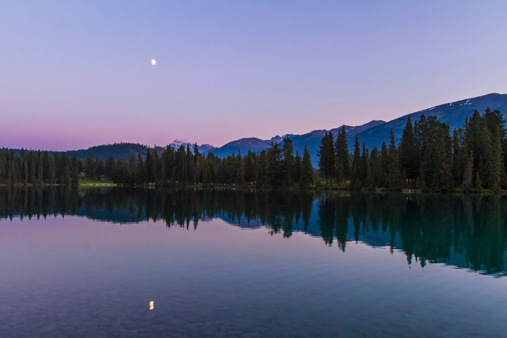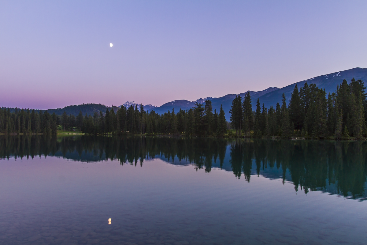 After a day of cloud and rain, skies cleared to provide a stunning twilight scene of the Moon reflected in the calm waters of Lac Beauvert in Jasper National Park.