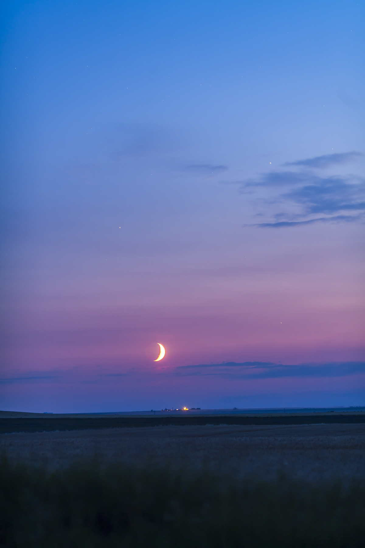 After an initial cloudy night, I made use of the (mostly) clear night on June 10 to shoot twilight scenes with the now four-day-old crescent Moon in the evening sky. Here I wanted to play with another technique I had not used much before: focus stacking.