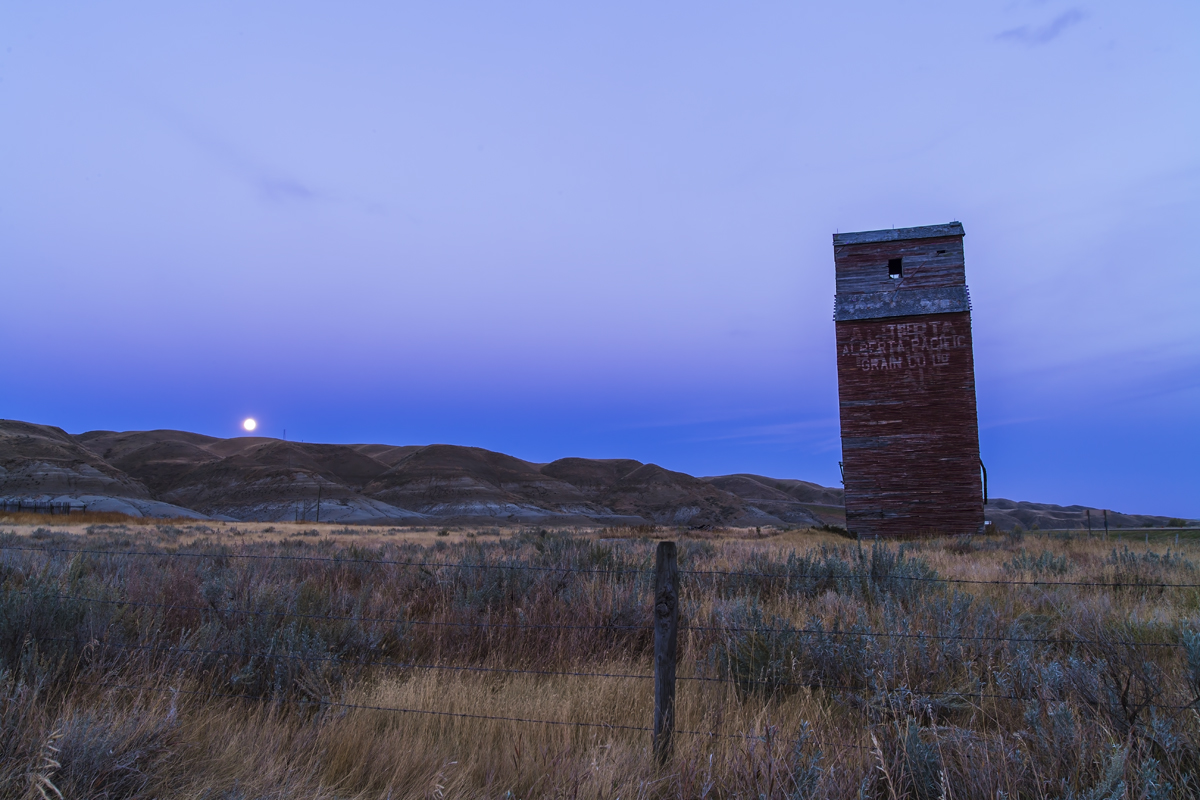 I shot this Friday evening, September 28, technically the day before Full Moon and the annual Harvest Moon. The location is amid the Wintering Hills Wind Farm northeast of me and south of Drumheller, Alberta.