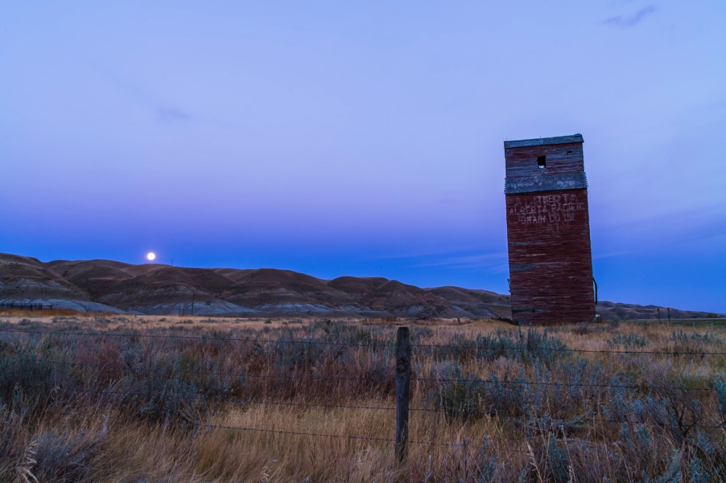 One of the last remaining wood grain elevators still stands as a historic roadside attraction near the little hamlet of Dorothy, Alberta. It’s seen better days.