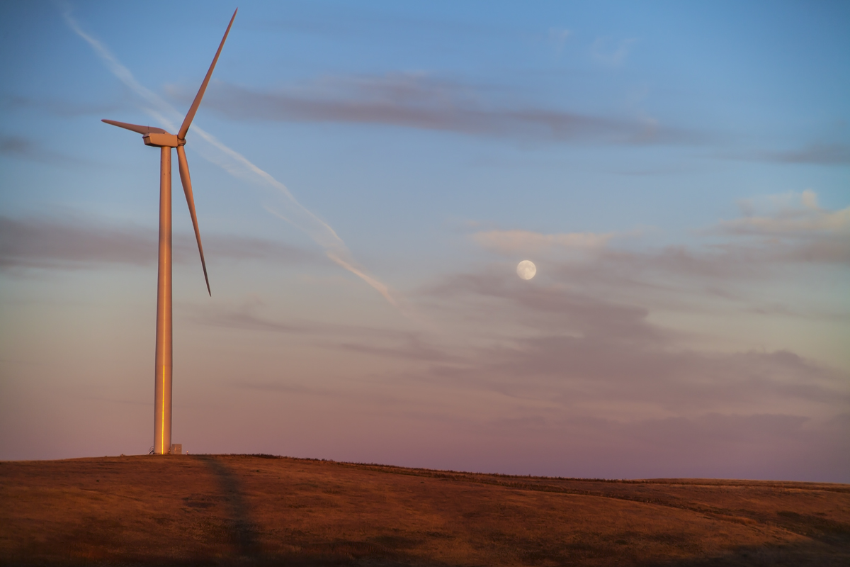 The Harvest Moon rises behind a new crop, a wind turbine harvesting the wind.