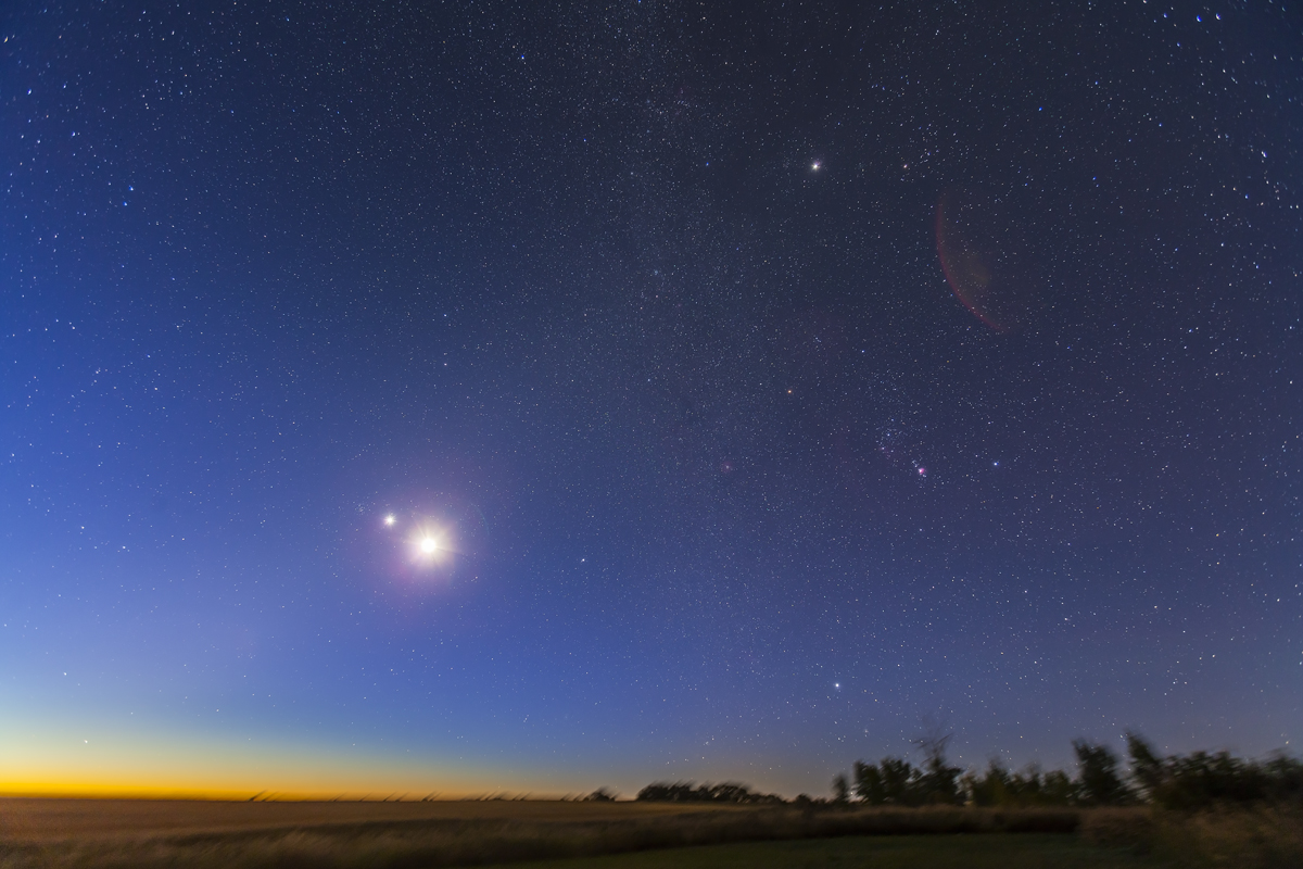 Orion stands above the trees, and at top is Jupiter amid the stars of Taurus. The star Sirius is just rising below Orion. And both the Moon, here overexposed of necessity, and Venus shine together below the clump of stars called the Beehive star cluster in Cancer. This was quite a celestial panorama in the morning twilight.