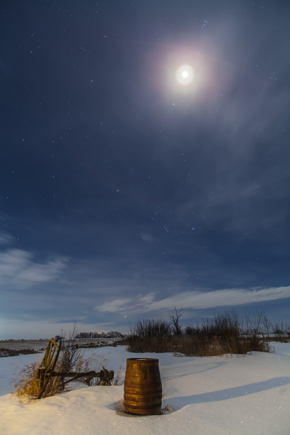 I shot this from southern Alberta with a Canon 60Da and an 18-200mm lens at 115mm to frame the Moon and prairie landscape.