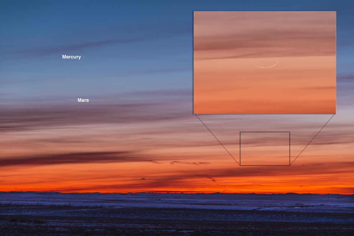 But the real catch of the night was the 18-hour-old crescent Moon, shimmering low in the red twilight. It appears as a razor-thin crescent, magnified in the inset. Sighting any Moon younger than 24 hours old is considered a find, the all-time record being a Moon about 14 hours old. I’m happy with an 18-hour catch!