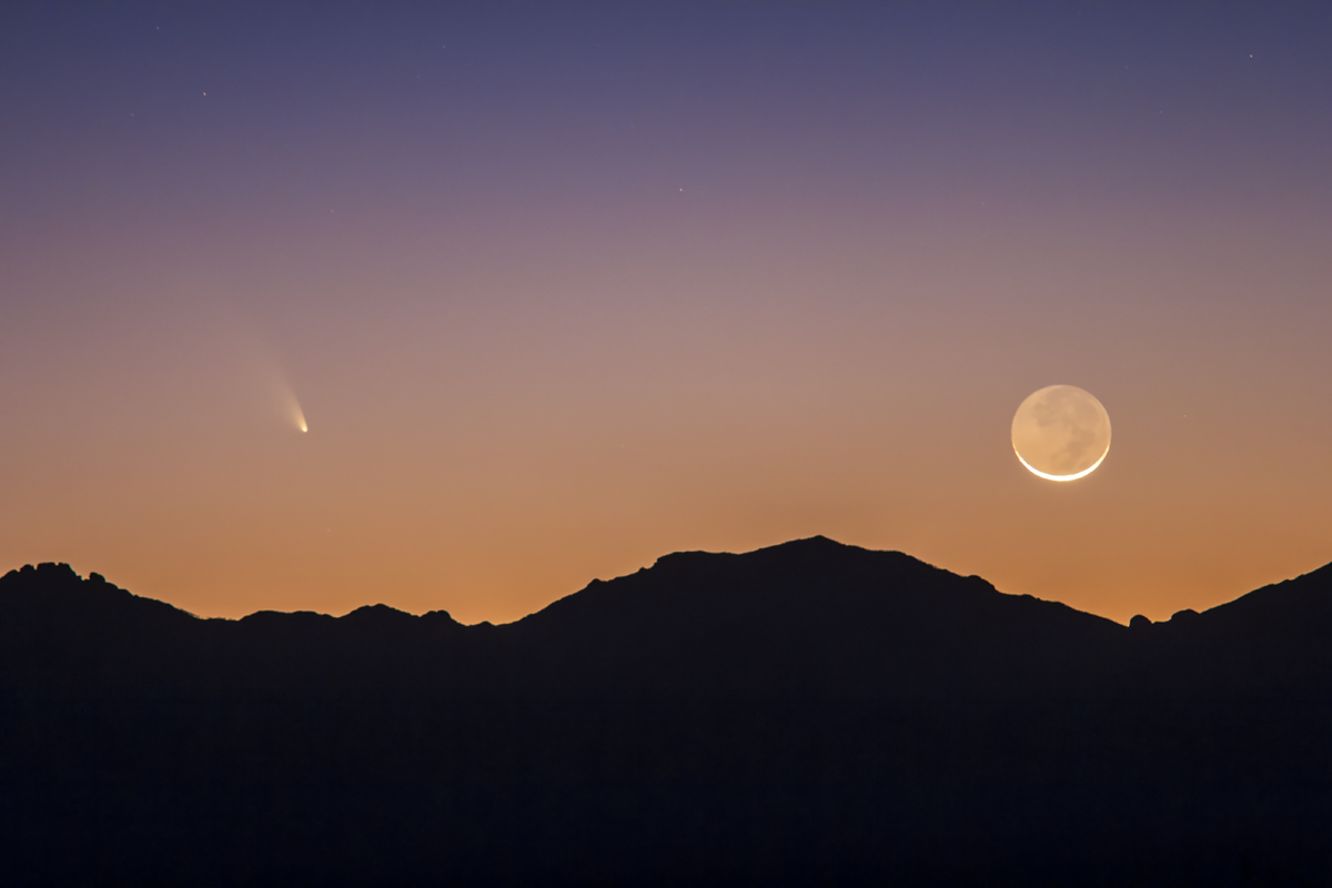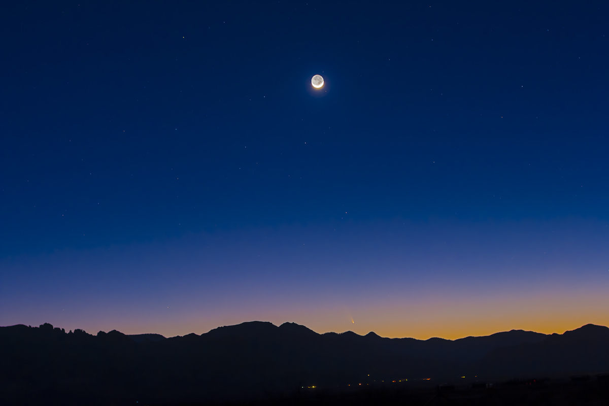The small comet sits low in the orange glow of twilight, where the Moon was last nightwhen it was down beside the comet. Tonight, a day later, the Moon appeared much higher in the sky as it waxes toward first quarter Moon in another few days. Tonight it was a crescent with most of the dark part of the lunar disk lit by Earthshine. I took this shot just before the comet set behind the mountains, to get the sky as dark as possible and the exposure longer to bring out some stars in the deepening blue of twilight.
