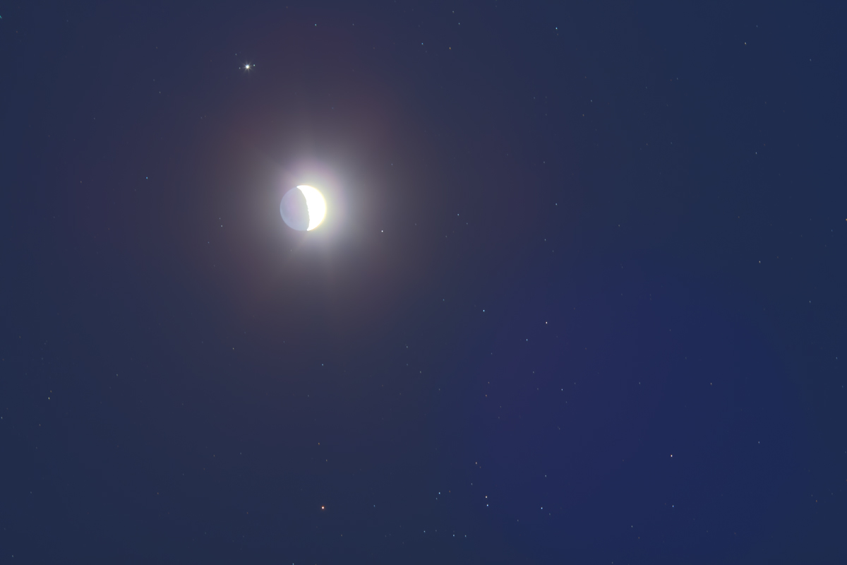 This is a high dynamic range (HDR) stack of seven exposures ranging from 6 seconds to 1/13 second, to capture the huge range in brightness from the sunlit Moon to the faint stars. Even so, the daylit side of the Moon remains overexposed. But the “dark side of the Moon” lit by Earthshine shows up well. A 135mm telephoto frames the field much as binoculars would show it.