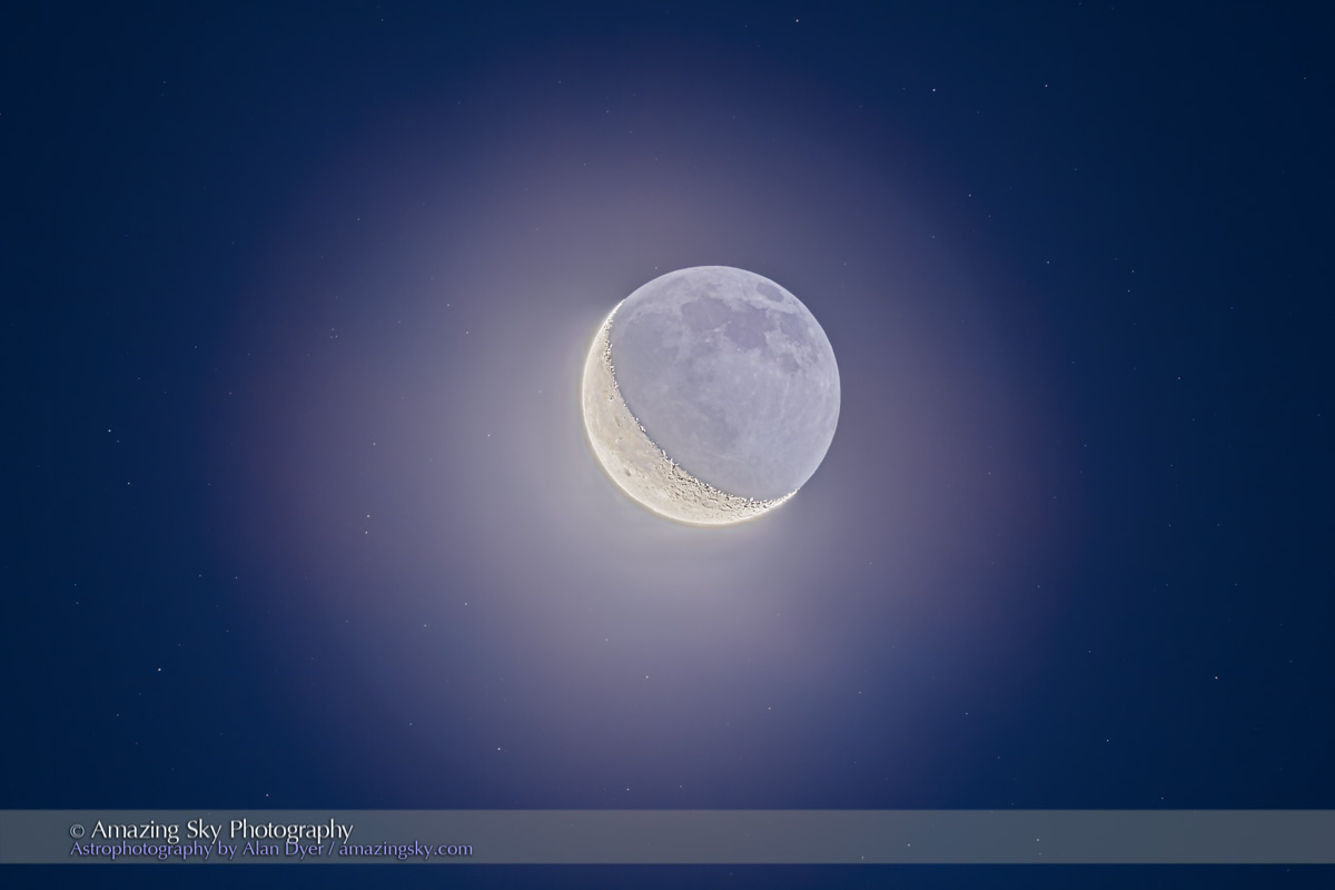 This view shows the sunlit crescent and the dark side of the Moon also lit by sunlight, but sunlight reflecting off the Earth first. The night side of the Moon is lit by blue Earthshine.