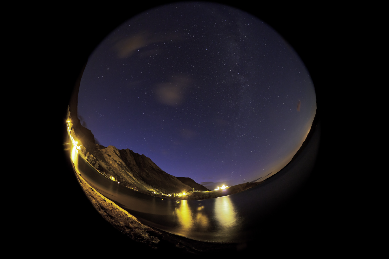 For this shot I set up at the end of the marina dock, looking north toward Polaris, the Big Dipper and Cassiopeia. This is a single 30-second exposure taken in deep twilight at the beginning of the night with the 10-22mm lens and Canon 7D camera. It’s one of 400+ frames taken for a time-lapse sequence. While lights from the hotel interior are somewhat picturesque and inviting it’s a pity that national parks still employ unshielded sodium vapour lights on roads. The streetlights are so bright and glaring they actually illuminate the mountainsides.