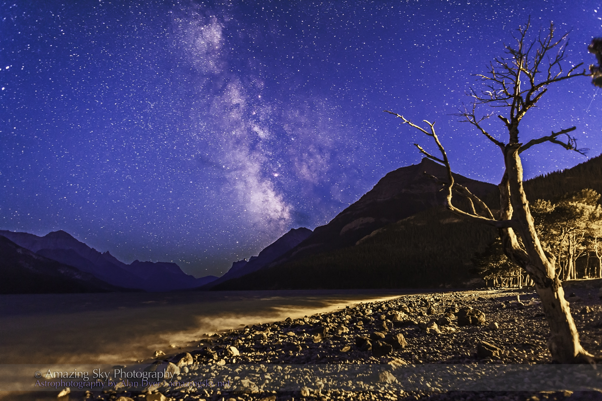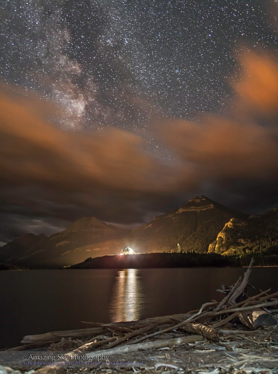 This is a view from Driftwood Beach on Middle Lake, looking south toward the Prince of Wales Hotel, the Park’s famous landmark, and a well-illuminated one at that. It shines beneath the Milky Way and clouds lit yellow from the town’s streetlights. It would take some work converting this site into a Dark Sky Preserve!