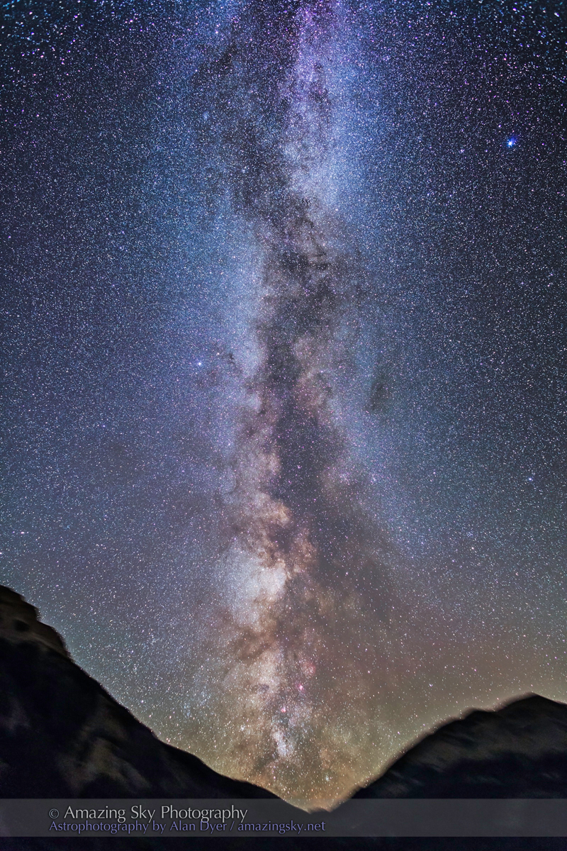I took both from a pull-off on the Red Rock Canyon road in Waterton. Each image is a stack of four 3-minute exposures, each tracking the stars with the camera on an iOptron SkyTracker.