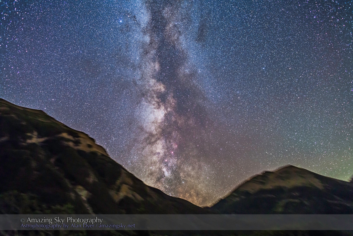 This was the scene last Saturday night, on a perfect summer night in the Rockies. The glorious starfields of the summer Milky Way are setting behind the mountains.
