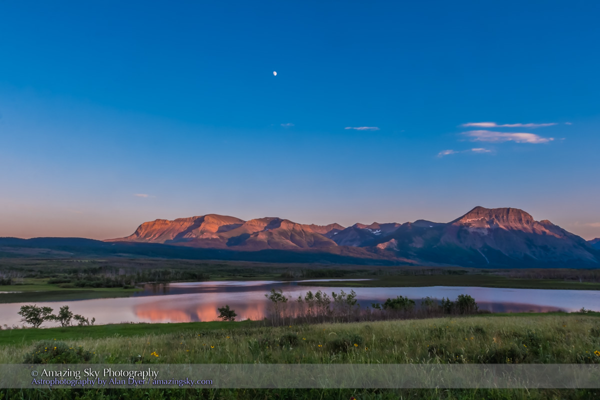 The rising waxing gibbous Moon in the sunset sky over Maskinonge Wetlands at Waterton Lakes National Park, Alberta, June 2015. The last rays of sunset are illuminating the peaks in alpen glow. This is an HDR stack of 3 exposures with the Canon 60Da and 16-35mm lens.